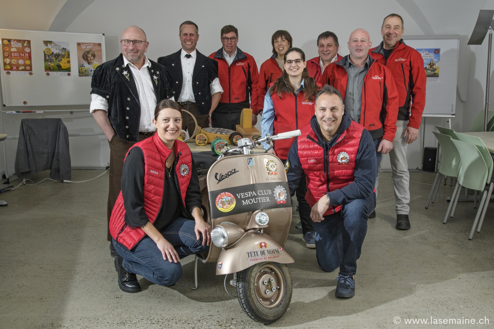 Composé d’un grand nombre de passionné-e-s de cette marque emblématique, le Vespa Club Moutier a honoré avec enthousiasme l’invitation des organisateurs de la Fête de la Tête de Moine. Son président Luigi Baglivo a précisé qu’il existait moult similitudes entre le fromage et le scooter, soit la passion, les traditions et le plaisir de se rencontrer. Tous les adeptes de ce scooter italien sont conviés à une balade dans la région. Rendez-vous le samedi 2 mai, dès 10 h devant la Maison de la Tête de Moine. A noter qu’un modèle, présenté en grande première à la conférence de presse, a été spécialement réalisée pour la Fête de la Tête de Moine ce qui a naturellement fait le régal des photographes. (oo)