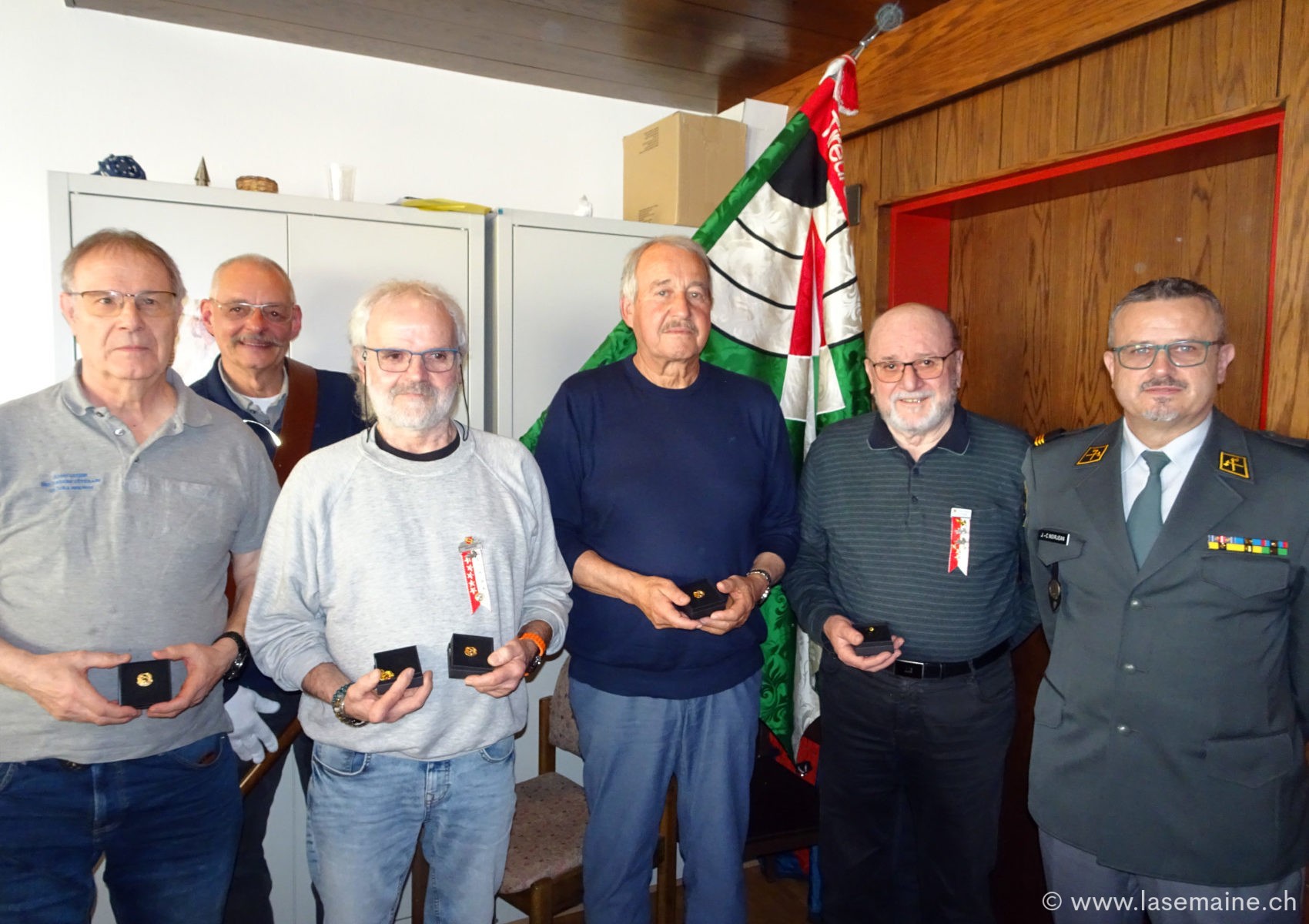 Cinq tireurs vétérans, toujours passionnés par le tir à 80 ans, ont été nommés vétérans d’honneur de l’ASTV. Ils ont reçu des mains du président cantonal le rameau d’or et le diplôme de circonstance. Il s’agit de Bernard Mérillat (Nods), Luc-André Jabas (Malleray), Paul Döbeli (Tramelan), Robert Aellen (St-Imier) et Michel Perrin (Neuchâtel) qui était excusé.