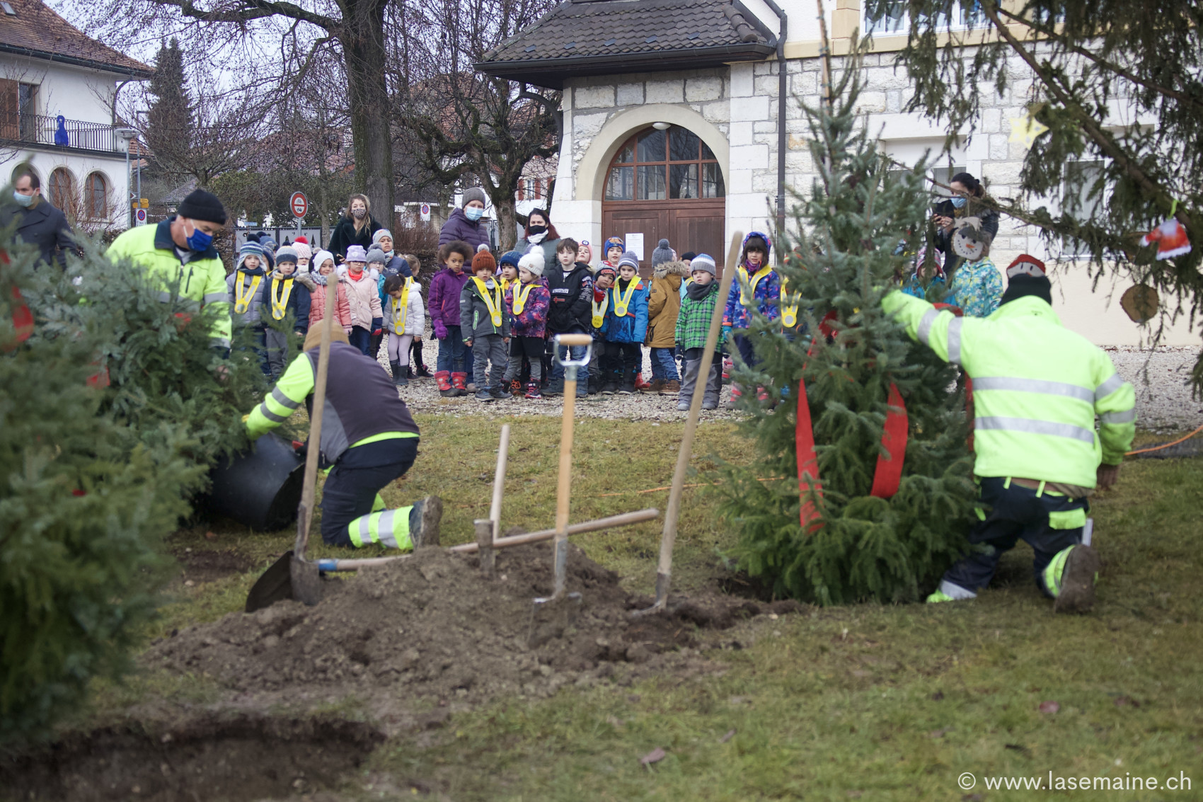 Des sapins, sous le sapin ! A l’initiative de la Société d’embellissement et de développement de Reconvilier, l’Ecole primaire du village a organisé vendredi 18 décembre dernier sa traditionnelle fête de Noël sur le parvis de l’établissement. Mais, coronavirus oblige, la sortie d’une soixantaine d’élèves des 3 classes d’école enfantine a été plus simple que d’ordinaire avec un goûter, somme toute extraordinaire. « On en a quand même profité pour parer les fenêtres de l’école de décorations de l’Avent et toutes les classes ont préparé un projet pour Noël, une poésie en vidéo en ligne avec accès protégé », souligne Yann Frischknecht, le directeur de l’école. Pour marquer le coup de manière originale, la direction de l’école a axé la fête en implantant 3 petits sapins sur l’herbe du préau à côté du grand conifère habituellement coupé, installé puis enlevé de là. Des employés communaux ont alors creusé 3 trous conséquents, y ont implanté les arbres et les bambins ont pu verser un gobelet de terre là où les sapins prennent racine. « Les élèves pourront ainsi les voir grandir tout au long de leur scolarité et de leur existence », ajoute Christian Graber, membre du comité de la Société d’embellissement.
