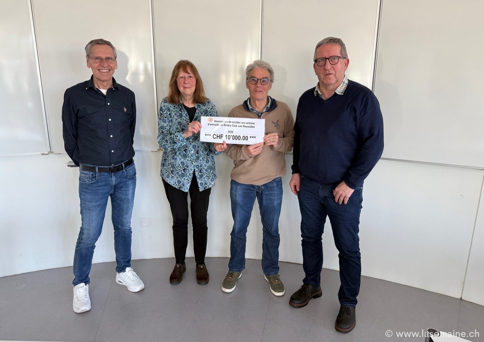 De gauche à droite : Erwin Dornbierer, président du Rotary Club Les Reussilles ; Irène Müller, secrétaire des Cartons du Cœur ; Jean-Pierre Gagnebin, président sortant des Cartons du Cœur et Francis Boos, président de l’Association de soutien aux actions d’entraide du RC. (photo ds)