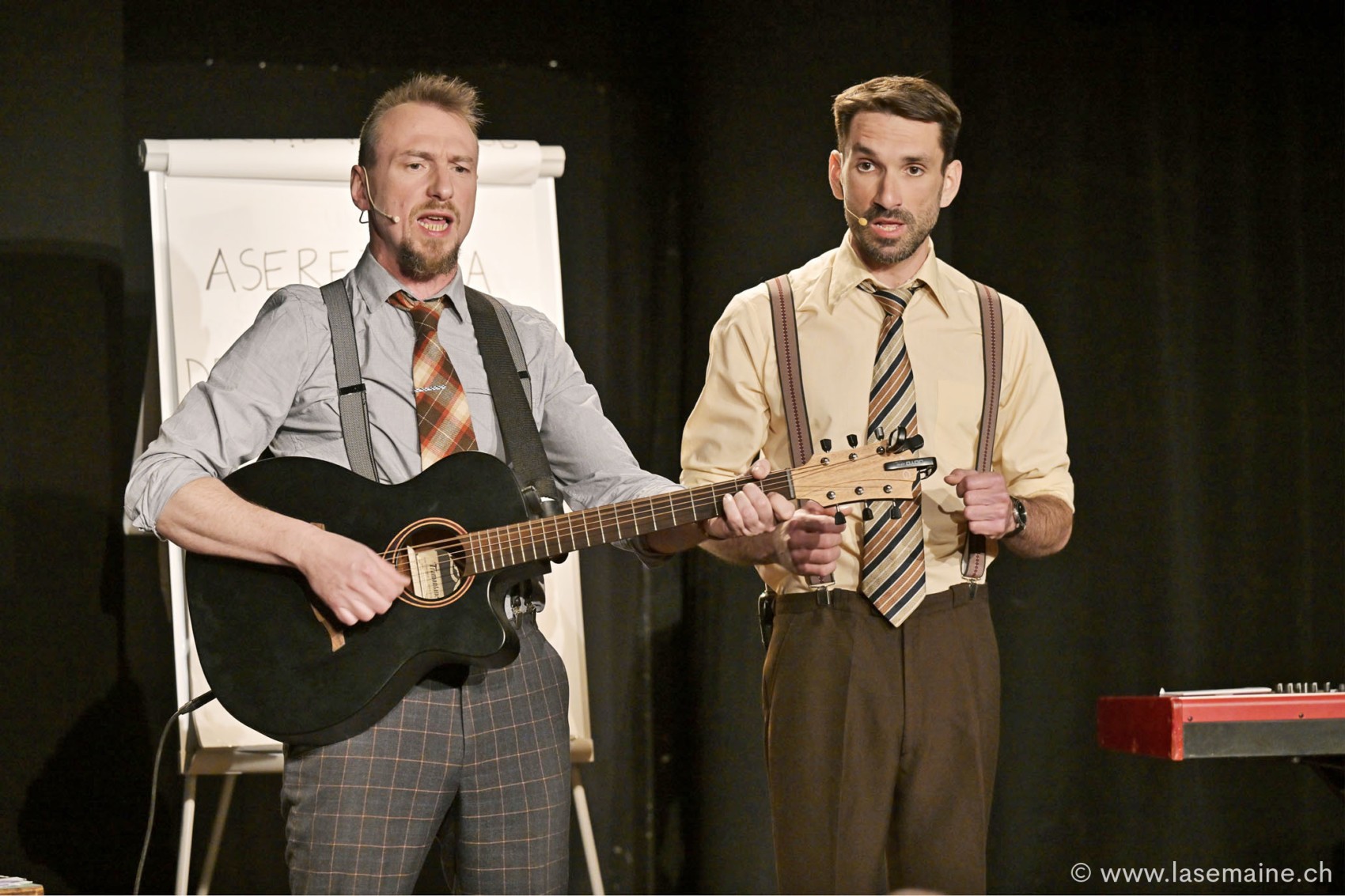 Les artistes. Nicolas Vezzoni et Lucas Lemauff sont tous deux Français, l’un vivant dans le Gers et l’autre établi à Toulouse depuis quinze ans. Après de multiples expériences dans différents groupes musicaux et vocaux, cabarets, fanfares, ils décident en 2017 d’organiser des blind tests musicaux décalés, utilisant leurs talents de multiinstrumentistes, leur amour de la chanson et de la dérision. Ils écrivent donc à quatre mains le spectacle d’humour musical « Sten et Chardon », qui a remporté un succès retentissant au Festival d’Avignon en 2024. Un spectacle à voir absolument, avant qu’il ne soit interdit. (cp)